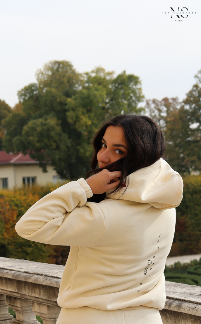 Felpa con elastico in vita per un effetto balloon, elastico ai polsi, cappuccio foderato in jersey, manica a giro in abbinato il Pantalone Modello trend con fondo largo e vita alta bordo riportato con elastico Cucitura verticale laterale spostata in avanti sulla stessa linea delle tasche Fondo con orlo